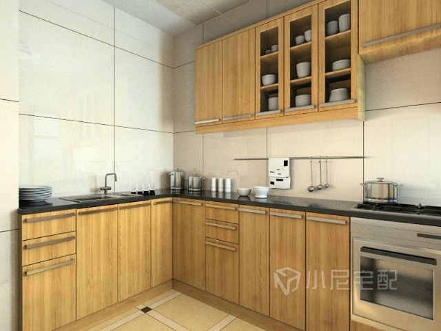 廚房定制木紋色整體櫥柜,功能齊全。協(xié)調(diào)統(tǒng)一。