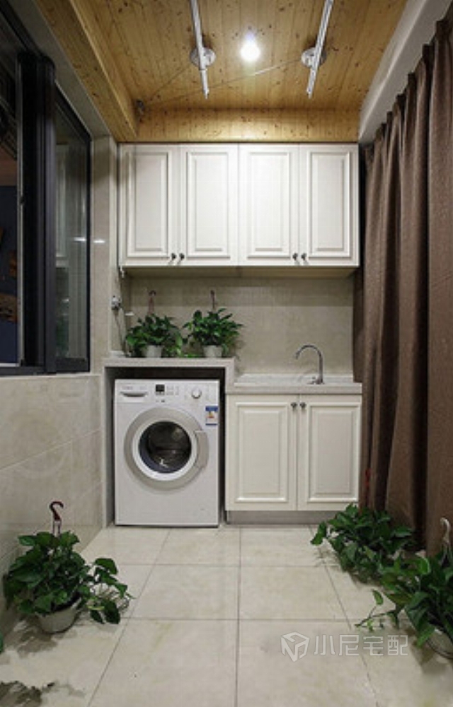 洗衣機放浴室怕受潮,放廚房又占地方,陽臺可以好好利用起來。通過定制置物架,把陽臺的部分空間做成洗衣房,洗衣、晾衣、燙衣,都可在陽臺上完成。除了洗衣外,還可以設計收納柜,種植花草等等。