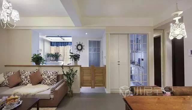 純粹的白色墻面單調乏味,設計師精心挑選了一扇腰門,讓進出書房多了一份田園趣味。 客廳與餐廳的家具簡單而質樸,在綠色植物的陪襯下,顯得簡約、大氣,恰有一份古樸韻味。