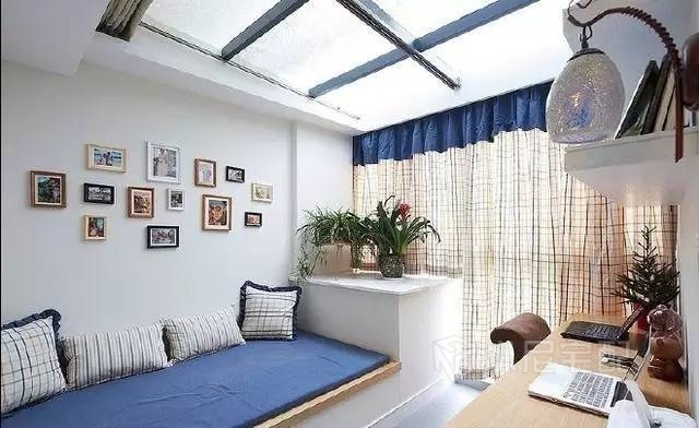 這個陽光書房由大陽臺改造而來,搭建玻璃天窗,增強采光,藍白色調營造出地中海式的自然浪漫。