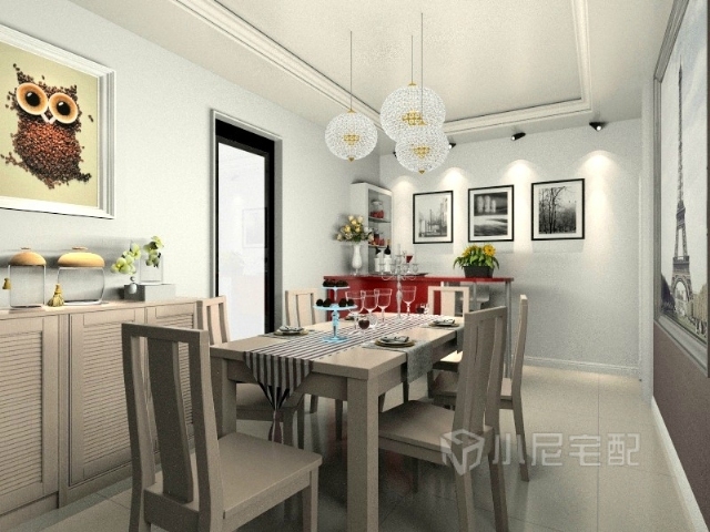 餐桌椅和餐邊柜與墻上的裝飾畫(huà)合理搭配,簡(jiǎn)潔大方,簡(jiǎn)單的產(chǎn)品布置完整的表達(dá)了餐廳的功能。