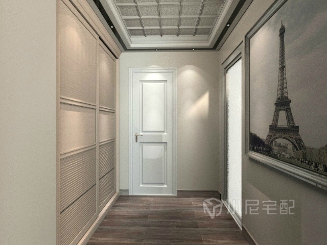 主臥進(jìn)門處,不大的空間用雙扇移門衣柜,小空間大利用,墻上的那座埃菲爾鐵搭,吾愛(ài)。