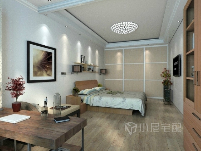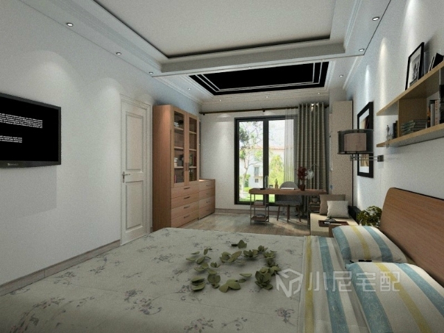 另一個(gè)視角看次臥室,吊頂將其一分為二,劃分出來(lái)一個(gè)獨(dú)立的辦公休閑區(qū)。