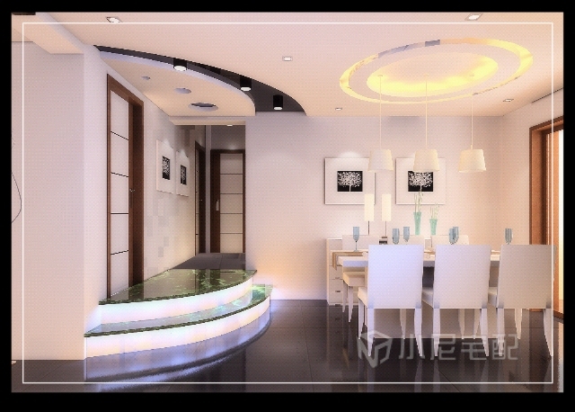 餐廳 走廊吊頂都用曲線來裝飾,臺階和吊頂形成照應(yīng)