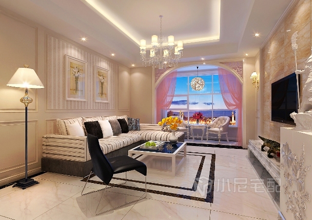 豎紋的背景和沙發(fā)顯得是如此的愜意。帶有雕花的埡口配上粉色紗簾也極為浪漫。