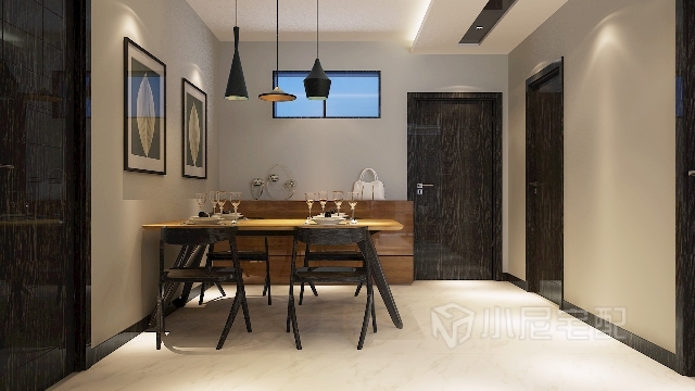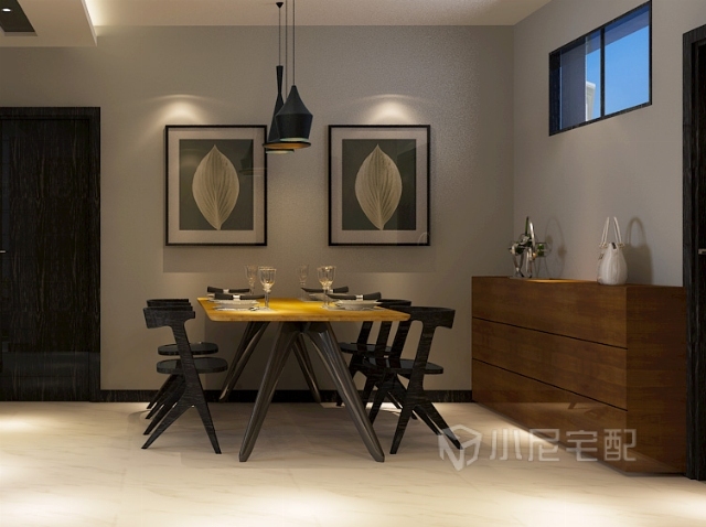 餐邊柜繼續(xù)保持木色和對稱和整體風(fēng)格一致,而稍富有變化的餐桌和時尚的吊燈給人稍歡快的感覺。