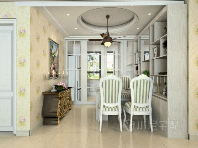 餐廳采用了圓形的吊頂,打破了平行的吊頂,使空間活躍了幾分。