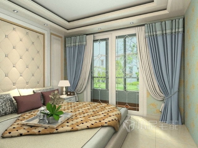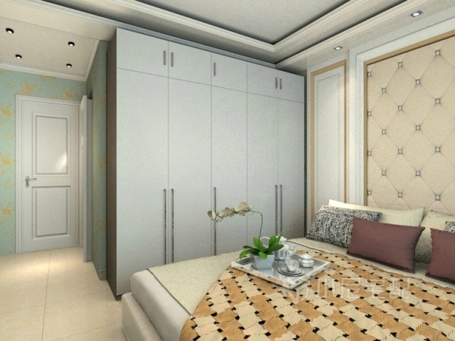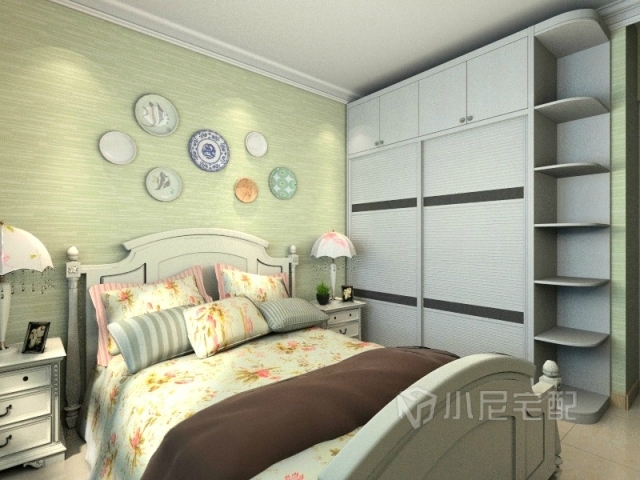 主臥用軟包做了個床頭背景,簡單的吊頂,小田園式的壁紙。