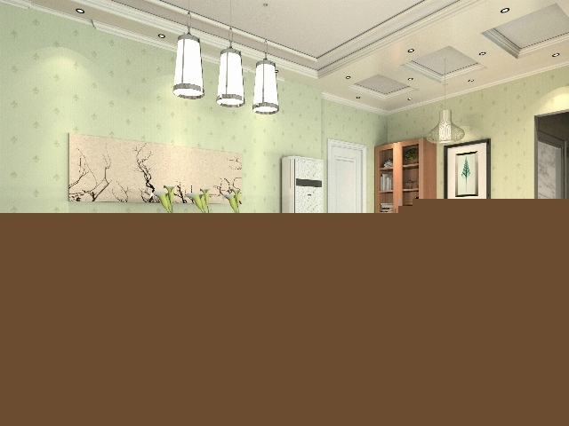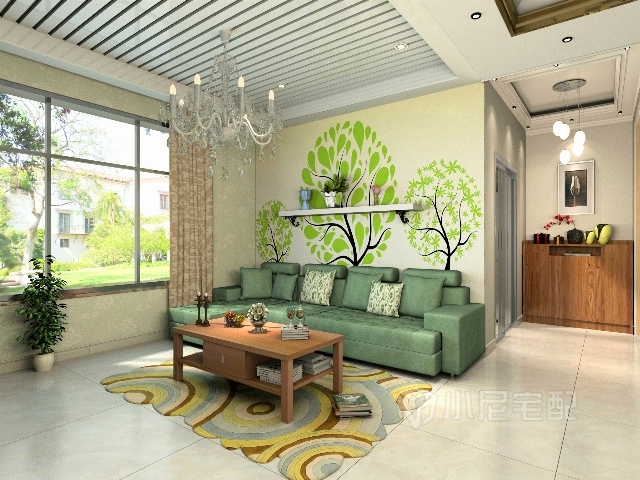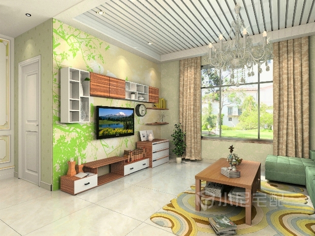 電視背景墻的一抹綠色墻紙給整個不大的空間帶來了生機(jī)。