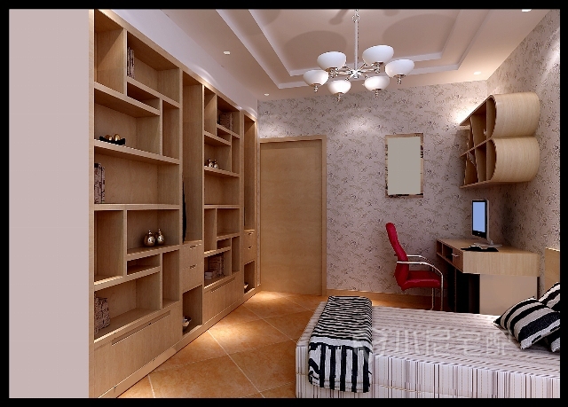 次臥整體較溫馨,必不可少的工作臺(tái),還有大容量?jī)?chǔ)物柜用來收納各種生活用品。
