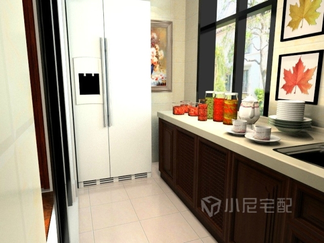 寬敞的對開門冰箱映照的是上班族時間的充忙和對生活的懶得,中式的櫥柜風格,營造了一個成功的未來之路。