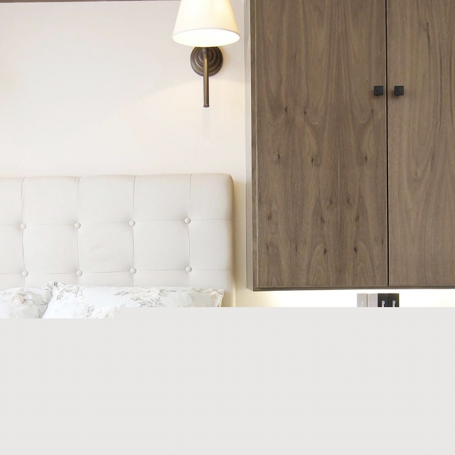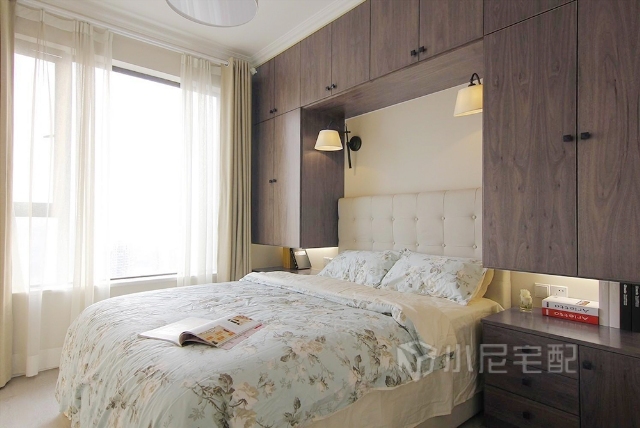 空間大小限制,將衣柜設(shè)置于床頭,床頭燈光滿足閱讀和夜燈功能。