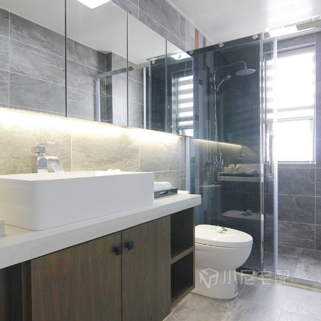 原本瘦長(zhǎng)形的衛(wèi)生間,大面鏡柜讓空間視野有延伸感,深灰色墻磚顯得冷靜,磚面紋理讓人有在石灘行走的感覺(jué)。