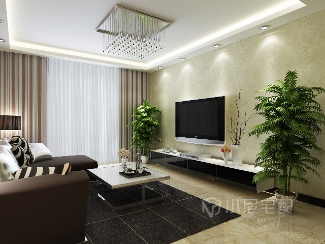 簡單的吊頂與飾面,使客廳看起來并不繁瑣,深淺搭配使整個(gè)空間看起來干凈整潔。配上綠植的明亮色彩,讓客廳少了一絲刻板,多了一份靈動。