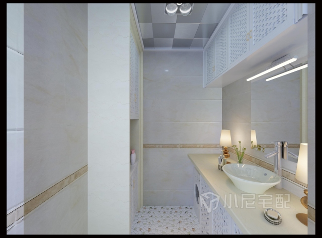 衛(wèi)生間采用兩色拼接鋁扣板設(shè)計,梳洗臺整體設(shè)計,連同洗衣機裝于臺下,使用空間大大提升