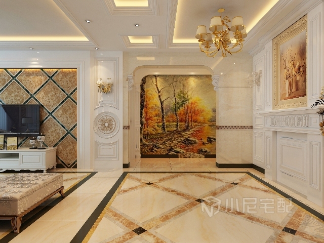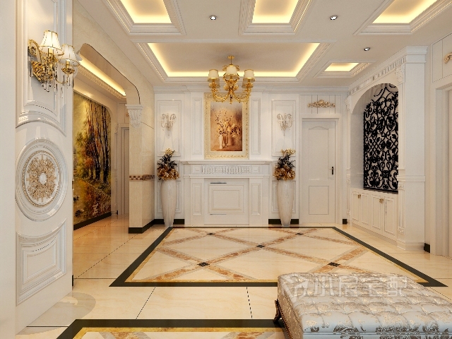 餐廳根據(jù)業(yè)主選擇,改成玄關(guān),壁爐造型搭配手工油畫,經(jīng)典的歐式組合