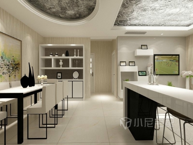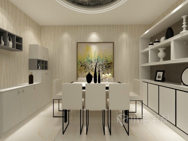 餐桌椅顏色與整體色調(diào)相搭配,兩側(cè)配有餐邊柜,墻壁上的裝飾畫(huà)畫(huà)龍點(diǎn)睛,用餐氣氛濃郁。