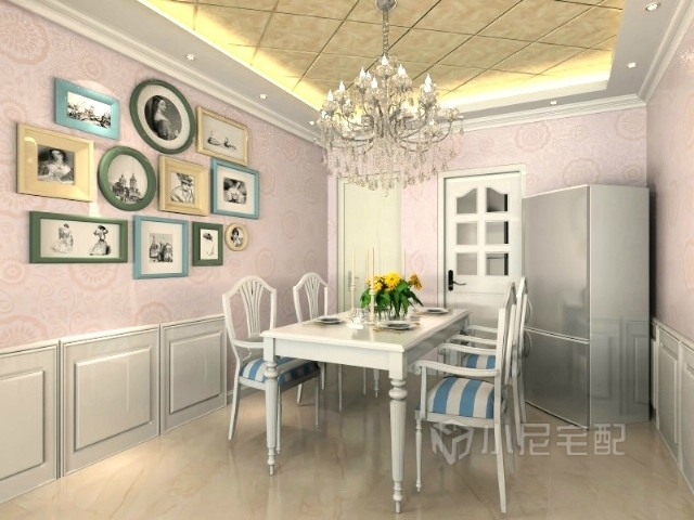 把帶有田園風格的餐桌和簡約而不單調(diào)的壁紙采用混搭,使用照片墻裝飾,餐廳不是簡簡單單的吃飯,而是一種溫馨而又暖意。