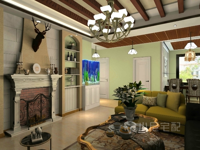 客廳。采用了美式特有的壁爐,為客廳增加溫暖氣息。