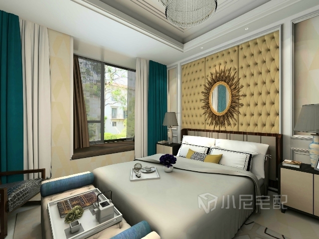 主臥。喜歡主臥明亮的色彩,墨綠色的窗簾和淡黃色的背景墻在這個(gè)空間融為一體。
