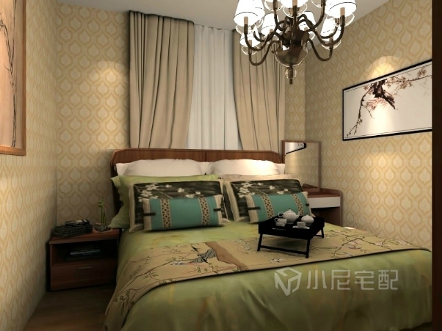 臥室的吊燈,給人一種中式的古樸之感,也增添了房間里的古韻氣息。 。