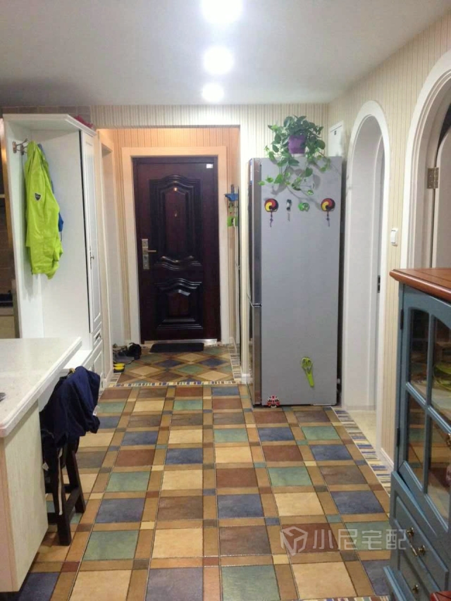 入戶位置,地面菱形鋪貼,配合彩色波打線,頂部石膏線和地中海風(fēng)情吸頂燈。