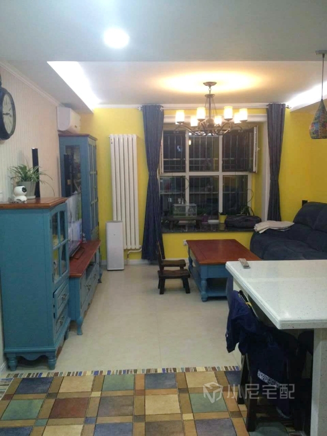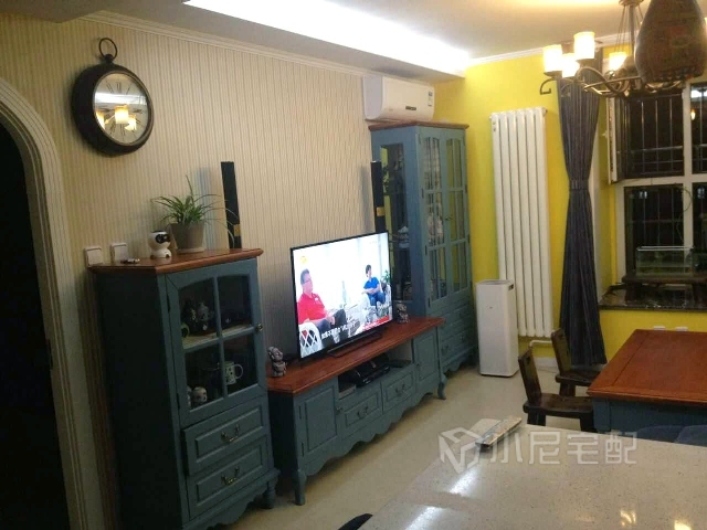 客廳黃色墻面、藍(lán)色電視柜