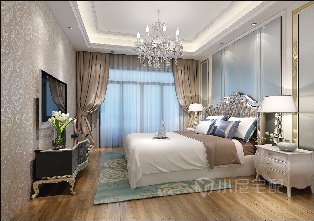 主臥室以簡(jiǎn)歐為主,利用淺藍(lán)給人一種一回到臥室就會(huì)有清新自如感覺(jué)