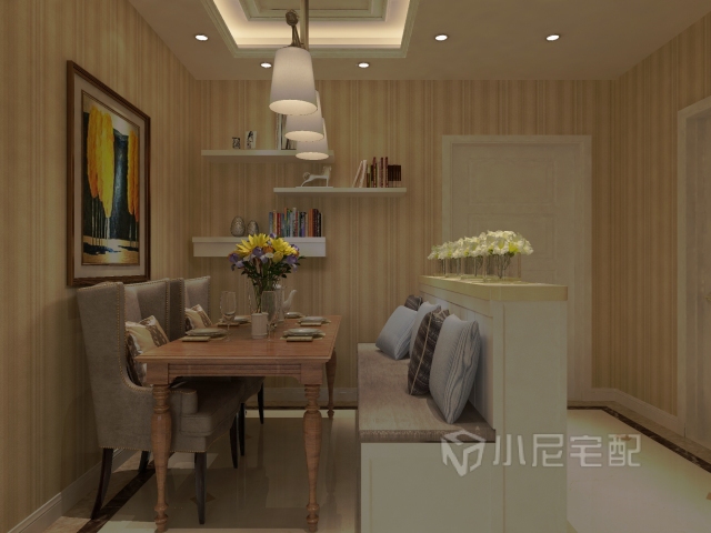 現(xiàn)代簡(jiǎn)歐,多以現(xiàn)代風(fēng)格為主,進(jìn)戶門餐廳區(qū)域利用壁掛層板增加了放置空間,同時(shí)利用卡座增加收納空間