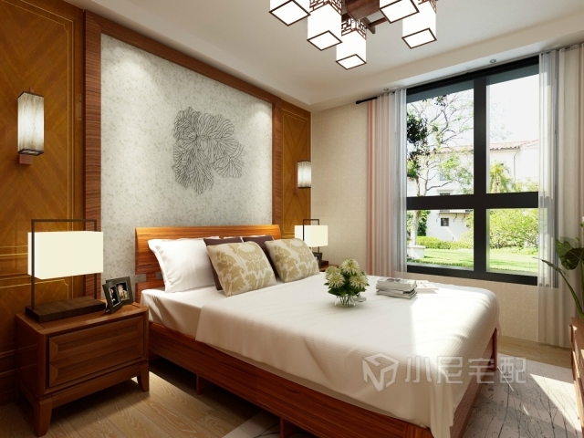 臥室背景墻選用與床顏色相近的木飾面板,使整個空間融為一體,顯得沉穩(wěn)大氣