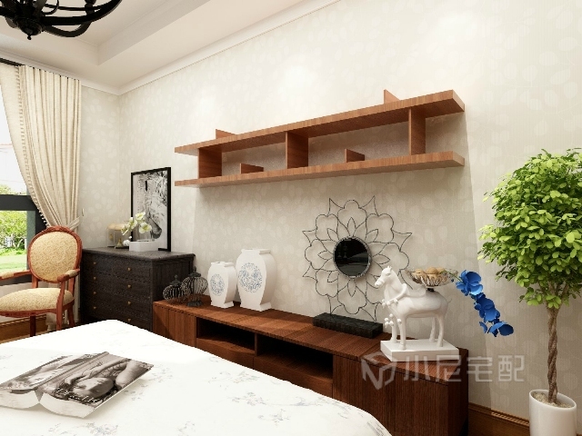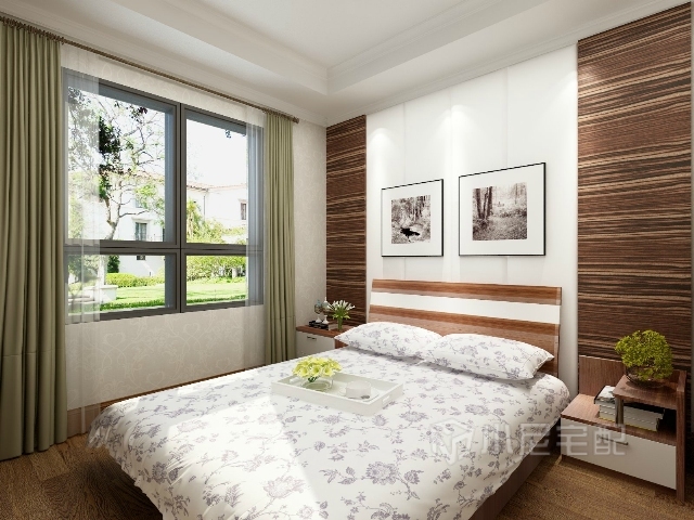木飾面的造型和床頭巧妙地呼應(yīng),淡綠色的窗簾為整個(gè)臥室增添一絲清新的味道。