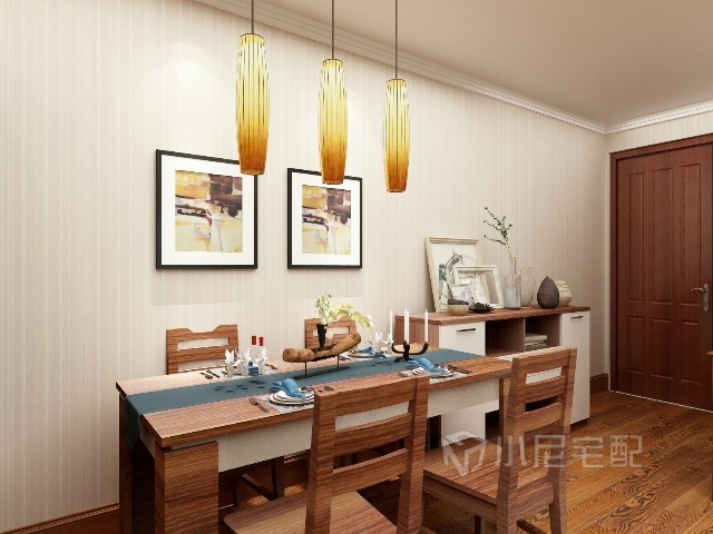 簡(jiǎn)單的掛畫,橘色的長(zhǎng)線吊燈,淡雅的條紋壁紙,一套餐桌椅,一個(gè)餐邊柜就營(yíng)造了一個(gè)非常舒適的就餐環(huán)境。