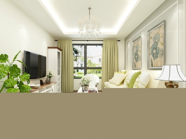 白色田園風格的電視柜組合,綠色的植物增加整個空間的活力。