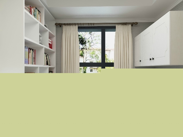 床頭墻選用葉子圖案的裝飾墻搭配草綠色的窗簾,增加自然的清爽的情調(diào)。