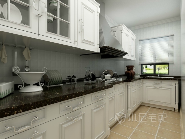 白色的櫥柜,淡藍色方格墻磚,黃色地磚,彰顯著輕松,隨性的生活態(tài)度