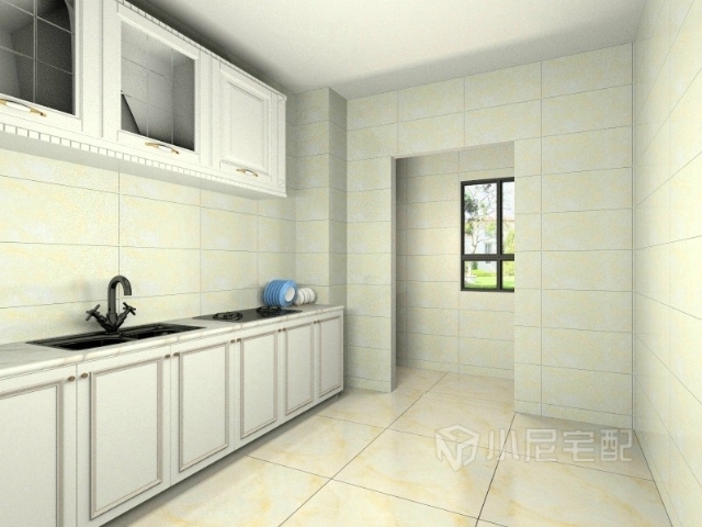 廚房選用簡(jiǎn)歐式的,主色暖白色,整潔的廚房會(huì)讓人有食欲