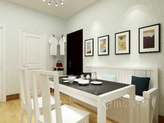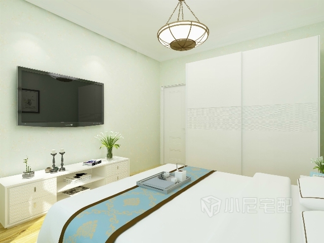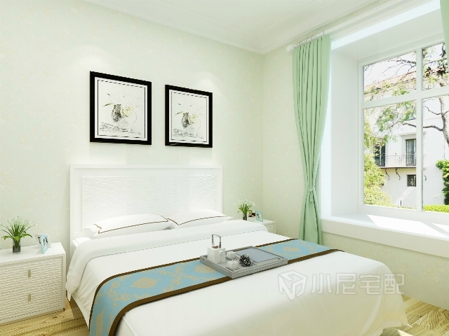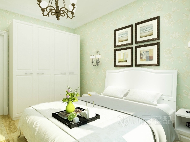 淡綠色的壁紙顯得清新脫俗,裝飾畫和壁燈裝飾床頭墻,白色的家具別具一格,簡(jiǎn)約大方。