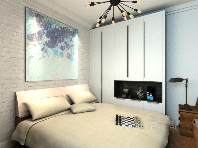 工業(yè)風(fēng)的家俱常有原木的蹤跡。主臥室正是采用了這一點(diǎn),粗狂的墻面與周圍的家具正好體現(xiàn)這一點(diǎn)