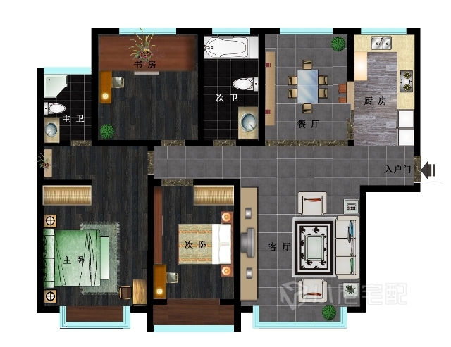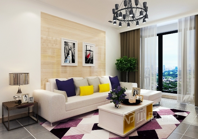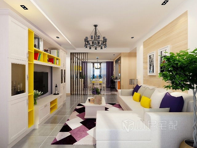 利用黃色和紫色為互補(bǔ)色,用紫色的抱枕和地毯做為點(diǎn)綴,活潑而不失優(yōu)雅。
