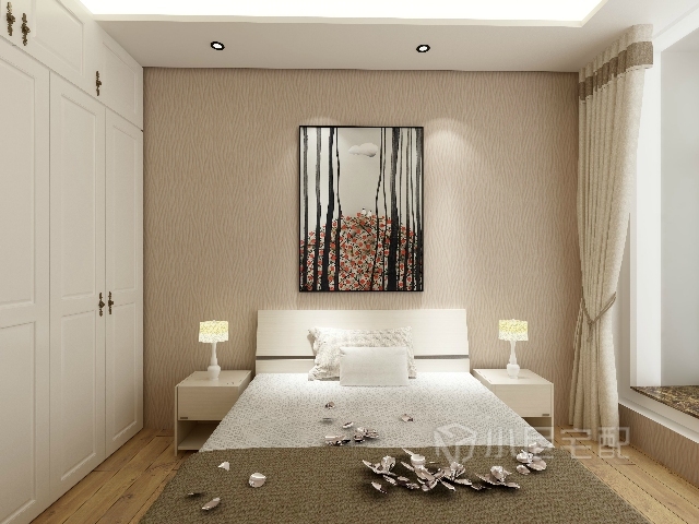 次臥也是以暖色壁紙搭配、床頭又掛現(xiàn)代裝飾畫、時(shí)尚又大氣。
