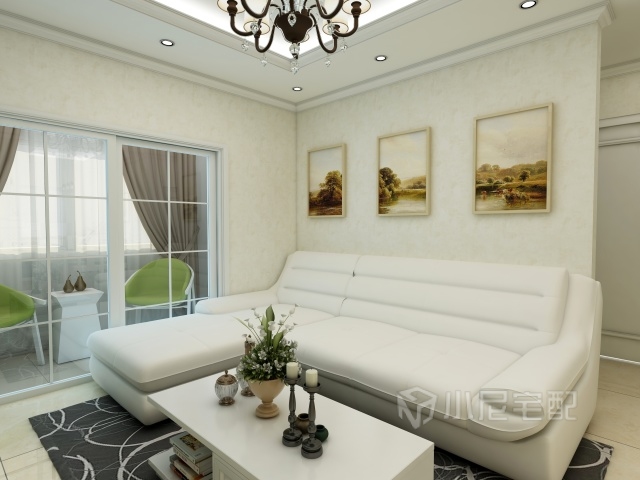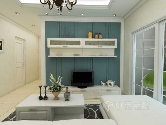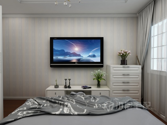 電視背景墻采用深色系與潔白的家具形成對(duì)比使整個(gè)空間更加明亮美觀