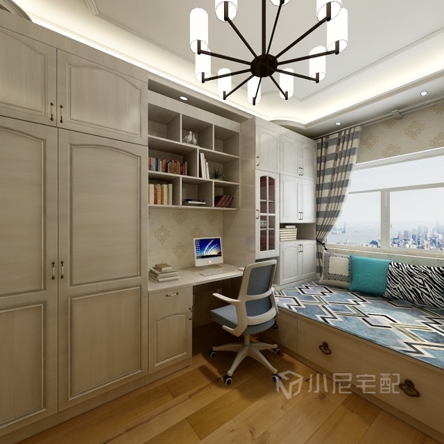 榻榻米加衣柜和書桌書架,合理利用空間,顏色是淺色木紋系列,溫馨不失莊重,有文化氣息。