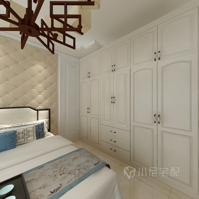 次臥,炕床加整體衣柜。以純白色為主,雖然做了滿屋的柜子,但是顏色清亮,不會顯得擁擠。