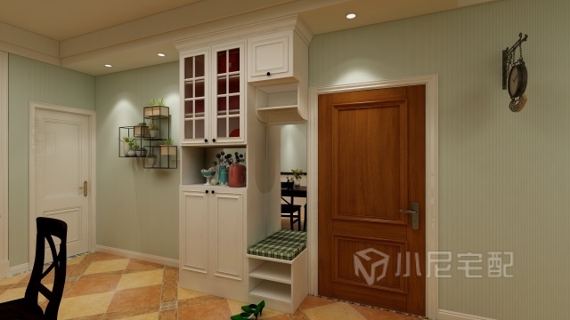 墻面對綠色的運用跟白色鞋柜的結(jié)合,給人一種簡潔純凈的感受,墻面的全身鏡子,不僅在出門做了著裝的整理,更在一定程度上衍生了視覺的感受。實用性與設(shè)計感雙雙具備。