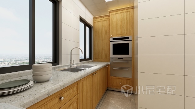廚房電器較多,冰箱、烤箱在西側(cè),灶臺(tái)旁抽屜放置調(diào)料,水盆旁抽屜分別放置餐具。