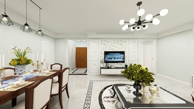 客廳地面中心采用水刀拼花,簡(jiǎn)單中不失特色,客廳餐廳區(qū)域采用不同吊燈區(qū)分,整體簡(jiǎn)潔,滿(mǎn)足使用功能。