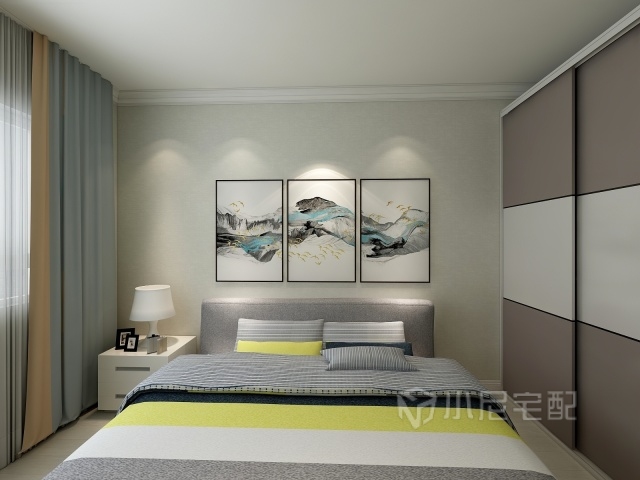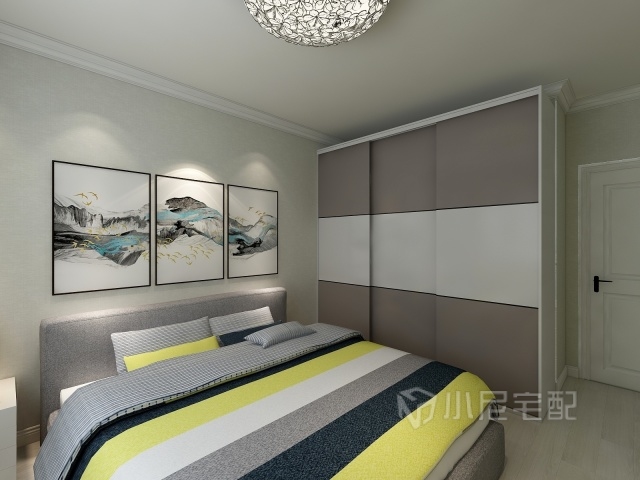 為了不讓空間看起來過于沉穩(wěn),選擇灰色的床,造型簡約的床頭燈,進(jìn)行視覺中和作用。顯得特別的溫馨