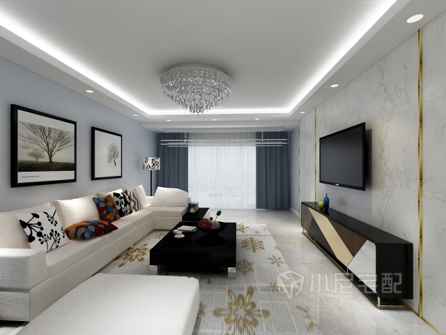 柔和的晨光從窗戶灑進(jìn)來,坐在舒適的布藝沙發(fā)上靜靜的看一本書亦或是和家人說笑。電視背景墻采用了石材加上金屬線條,給人眼前一亮的感覺。