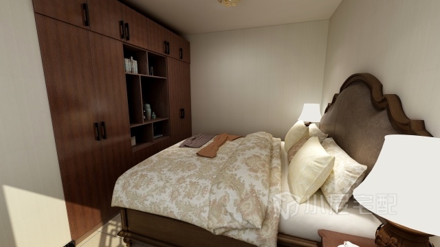 次臥加入了定制家具,在床尾處的衣柜不能能滿足儲(chǔ)物需要還可以滿足在床上看電視等娛樂(lè)需求。