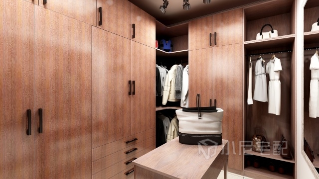 L型的衣柜保圍著中間的梳妝臺(tái),為化妝與試穿提供寬敞的空間和氛圍。